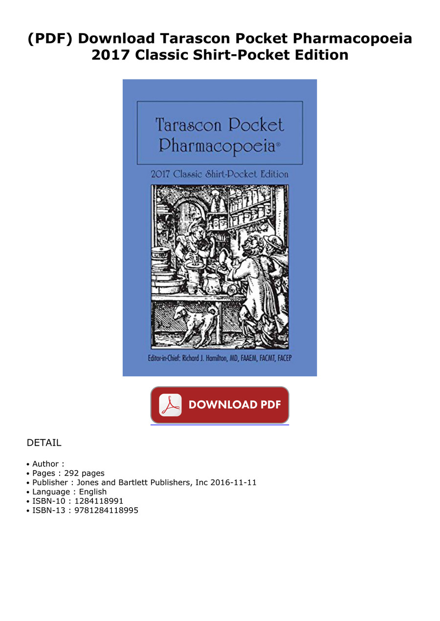 Only 7 left in stock (more on the way). Some are essential to make our site work; Assembled product dimensions (l x w x h) 9.00 x 6.00 x 1.50 inches. With over ten million copies in print, the tarascon pocket pharmacopoeia is the world's leading pocket drug reference and has been the most popular and trusted source of point of care drug information since 1987. 4.6 out of 5 stars 148. Hamilton | dec 16, 2019 4.8 out of 5 stars 707 This reference also includes typical drug dosing (all fda approved), available trade and. Hamilton | dec 1, 2017. Hamilton | dec 16, 2019 4.8 out of 5 stars 604 Free shipping on orders over $25 shipped by amazon. Top 10 apps like art and science of pharma. 14,288 likes · 3 talking about this. Tarascon pharmacopoeia continues its tradition as the leading portable drug reference packed with vital drug information to help physicians, nurses, residents, interns and medical students make better dosing decisions at point of care.